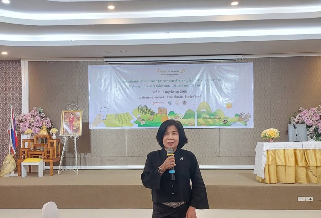 วันที่ 12 พฤศจิกายน 2568 นางรัตดา คงสีไพร เกษตรจังหวัดสุรินทร์ เป็นประธานเปิดการฝึกอบรมวิทยากรหลักสูตร “การทำนาเทคโนโลยีที่เท่าทันต่อภูมิอากาศ” (Climate Smart Rice Production: Training of Trainer) ระดับอำเภอ (L2) และระดับตำบล (L3) จังหวัดสุรินทร์ ณ ห้องประชุมเอมอรแกรนด์เอ สวนป่ารีสอร์ท ตำบลเฉนียง อำเภอเมือง จังหวัดสุรินทร์