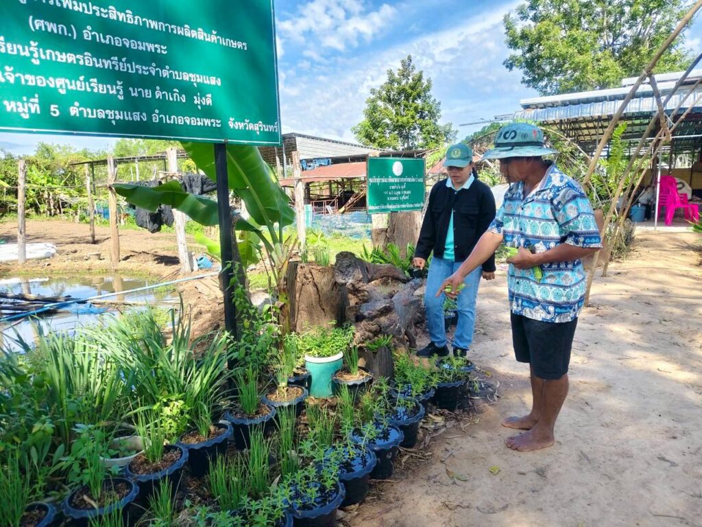 วันที่ 24 ตุลาคม 2568 เวลา 09.30 น. นางสาวนันทา เพราะทอง เกษตรอำเภอจอมพระ มอบหมายให้นางสาวจอมศรี มะลิซ้อน นักวิชาการส่งเสริมการเกษตรชำนาญการ พร้อมด้วยนางสาวสุทธาสินี ปิ่นทอง นักวิชาการส่งเสริมการเกษตรปฏิบัติการ ลงพื้นที่เยี่ยมเยียนศูนย์เรียนรู้การเพิ่มประสิทธิภาพการผลิตสินค้าเกษตร (ศูนย์เครือข่าย) ของนายดำเกิง มุ่งดี ดำเนินกิจกรรมเกษตรผสมผสาน ปลูกข้าวนาปี ผัก และปศุสัตว์ ในพื้นที่ 7 ไร่ ณ บ้านอุดม หมู่ที่ 5 ตำบลชุมแสง อำเภอจอมพระ จังหวัดสุรินทร์
