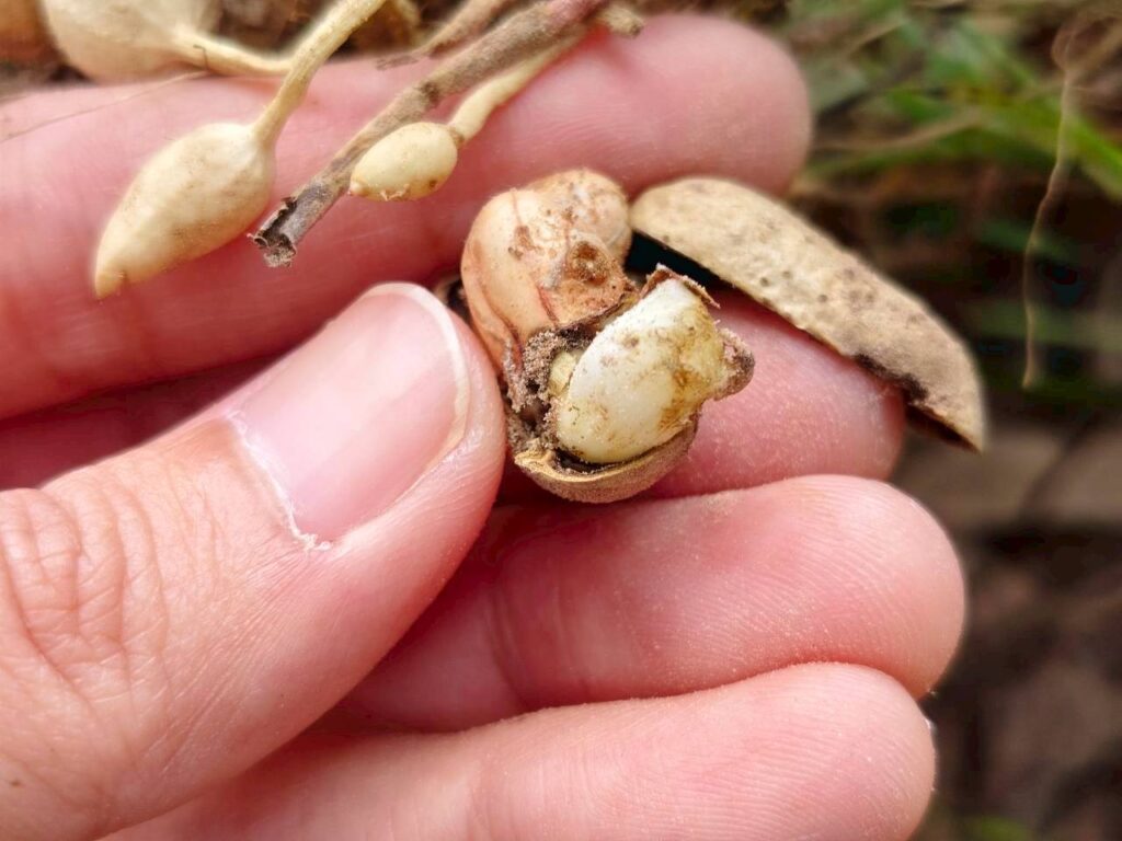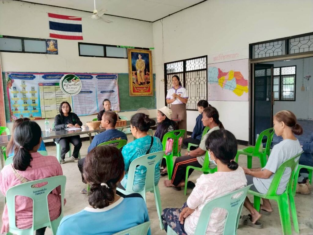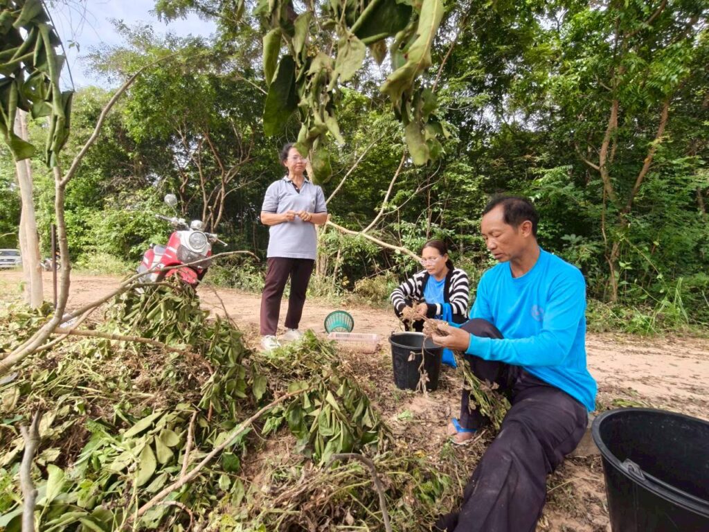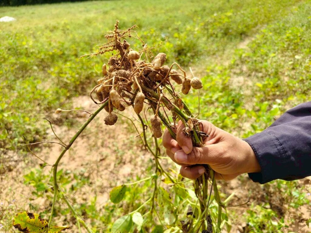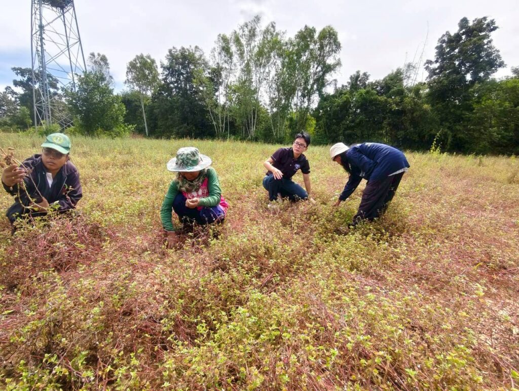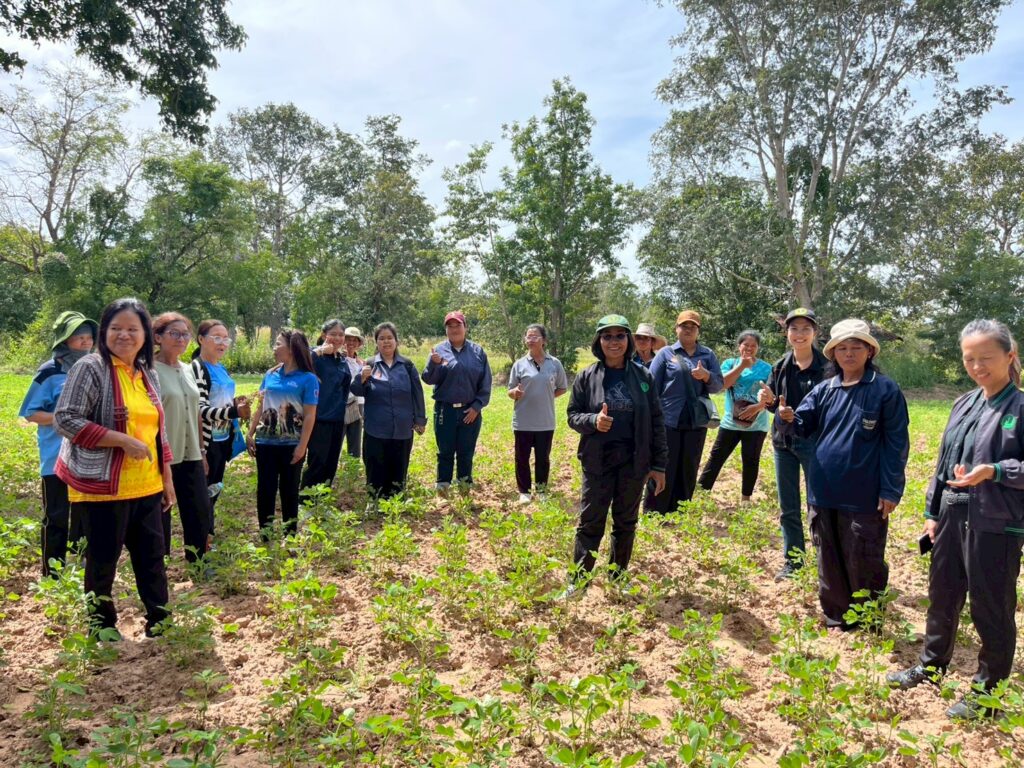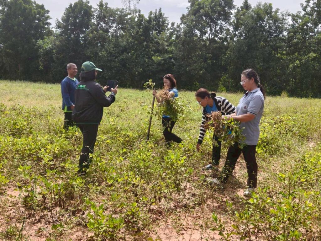 วันที่ 6 พฤศจิกายน 2568 นางสาวนันทา เพราะทอง เกษตรอำเภอจอมพระ พร้อมด้วยนักวิชาการส่งเสริมการเกษตรอำเภอจอมพระ และเจ้าหน้าที่สำนักงานเกษตรจังหวัดสุรินทร์ ลงพื้นที่ติดตามการดำเนินงานในโครงการส่งเสริมและพัฒนาเพื่อเข้าสู่ห่วงโซ่อุปทานและบริการมูลค่าสูง ชี้แจงกิจกรรมยกระดับสินค้าเกษตรและบริการมูลค่าสูง (ถั่วลิสงคุณภาพดี) และเรื่องการรับมือให้เท่าทันกับการเปลี่ยนแปลงของสภาพภูมิอากาศของโลกที่ส่งผลกระทบต่อภาคการเกษตร พร้อมลงพื้นที่เยี่ยมชมแปลงถั่วลิสง ตรวจแปลงเพื่อวิเคราะห์ปัญหาที่พบในการเพาะปลูกถั่วลิสงของสมาชิกกลุ่มวิสาหกิจชุมชนเกษตรผสมผสานบ้านสมบูรณ์ โดยปัญหาหลักที่พบในกลุ่มคือ ปัญหาศัตรูพืชในแปลง เช่น เพลี้ยอ่อน ปลวก และเสี้ยนดิน และปัญหาด้านสภาพภูมิอากาศที่แปรปรวน ส่งผลให้ผลผลิตและการเก็บเกี่ยวถั่วลิสง ณ ที่ทำการกลุ่มวิสาหกิจชุมชนหมู่ที่ 6 ตำบลชุมแสง อำเภอจอมพระ จังหวัดสุรินทร์
