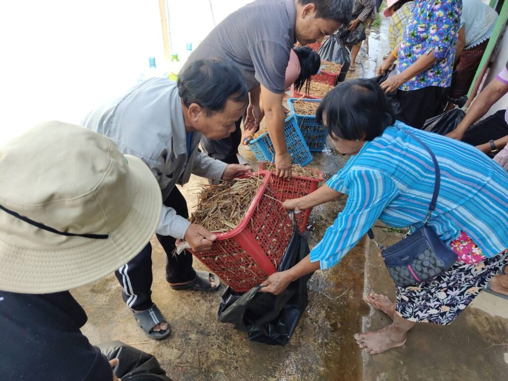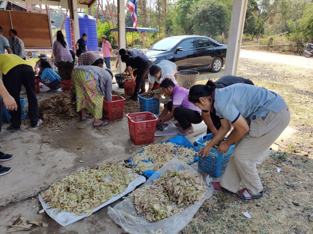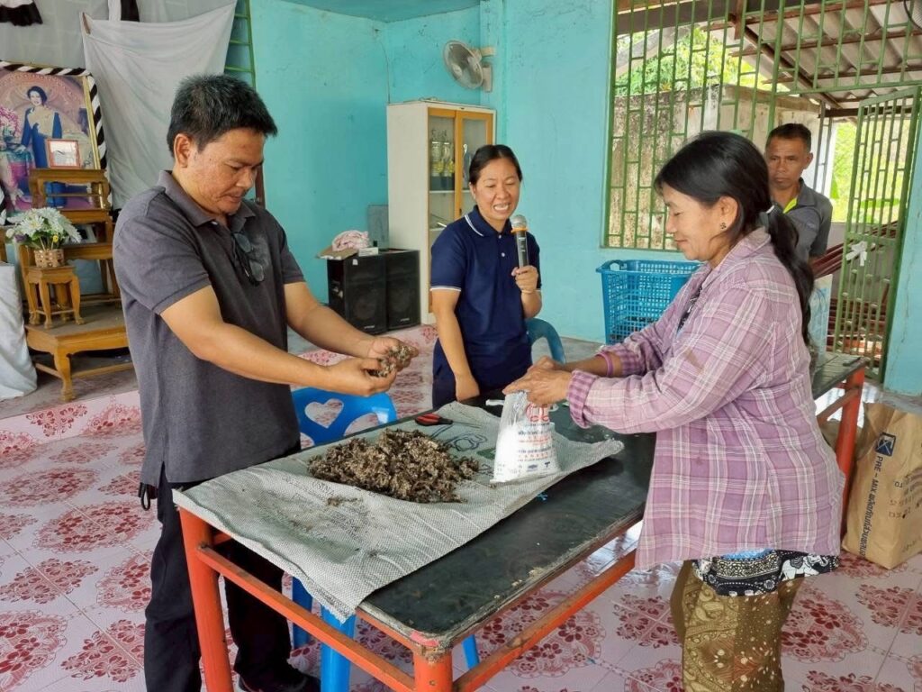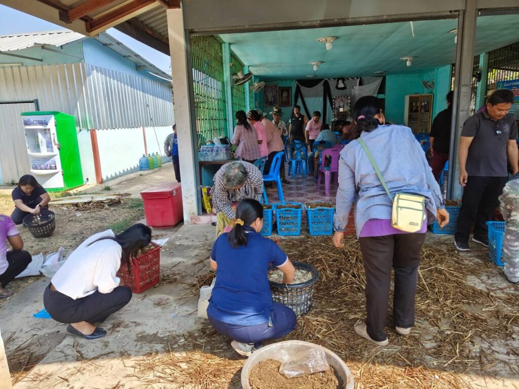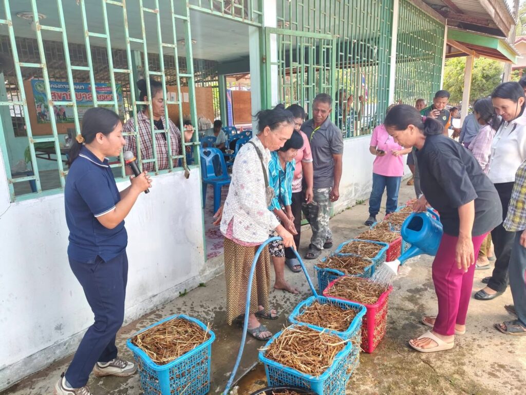 – การผลิตเห็ดฟางในตระกร้า เพื่อเป็นแนวทางให้ผู้ที่เข้าร่วมโครงการนำไปประกอบอาชีพ ณ ศาลาประชาคมหมู่ 7 บ้านโพธิ์ทอง ตำบลตะเคียน อำเภอกาบเชิง จังหวัดสุรินทร์