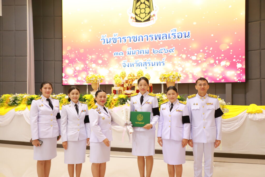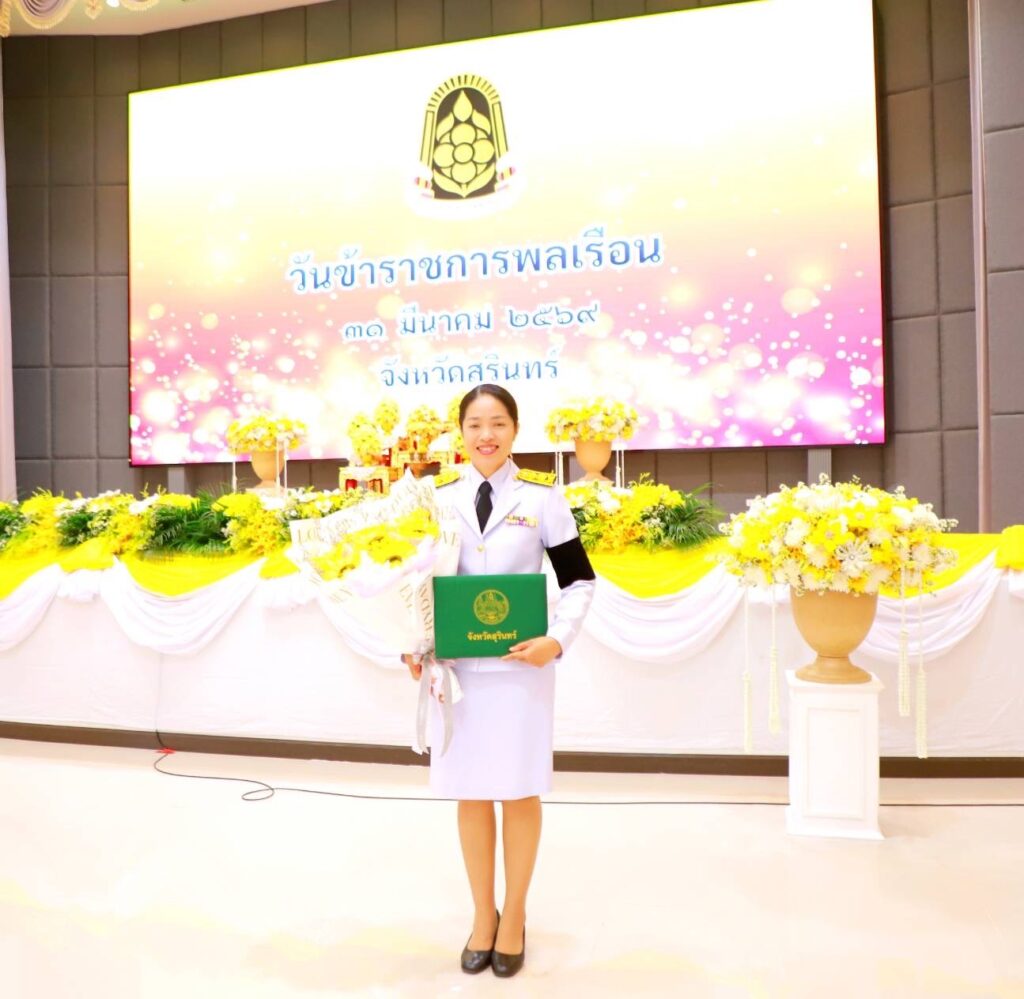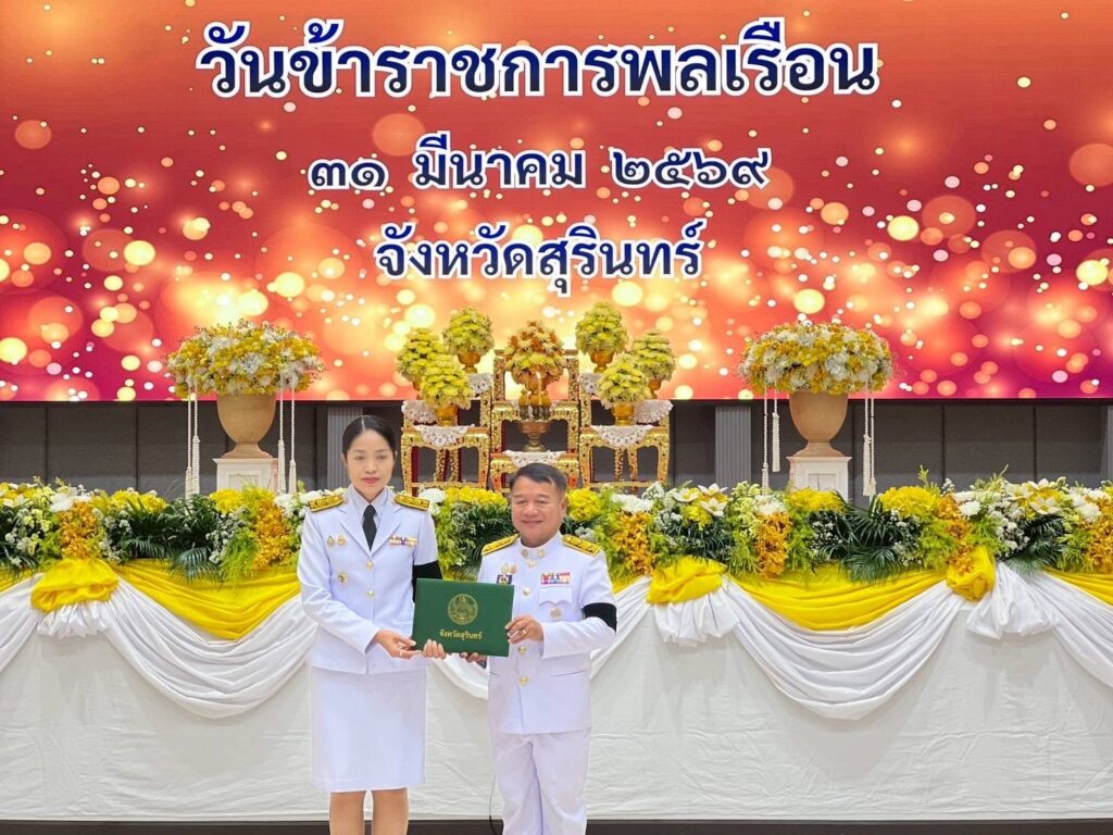 ในโอกาสนี้ นางปิญพร บุญเยี่ยม เกษตรอำเภอเขวาสินรินทร์ ได้รับเกียรติเข้ารับรางวัล “ข้าราชการพลเรือนดีเด่น จังหวัดสุรินทร์ ประจำปี 2569” ซึ่งถือเป็นรางวัลทรงเกียรติที่มอบให้แก่ข้าราชการที่ประพฤติตนเป็นแบบอย่างที่ดี ตามหลักจริยธรรม 7 ประการ และมีผลงานเชิงประจักษ์ในการสร้างสรรค์ประโยชน์ต่อทางราชการและประชาชนในพื้นที่