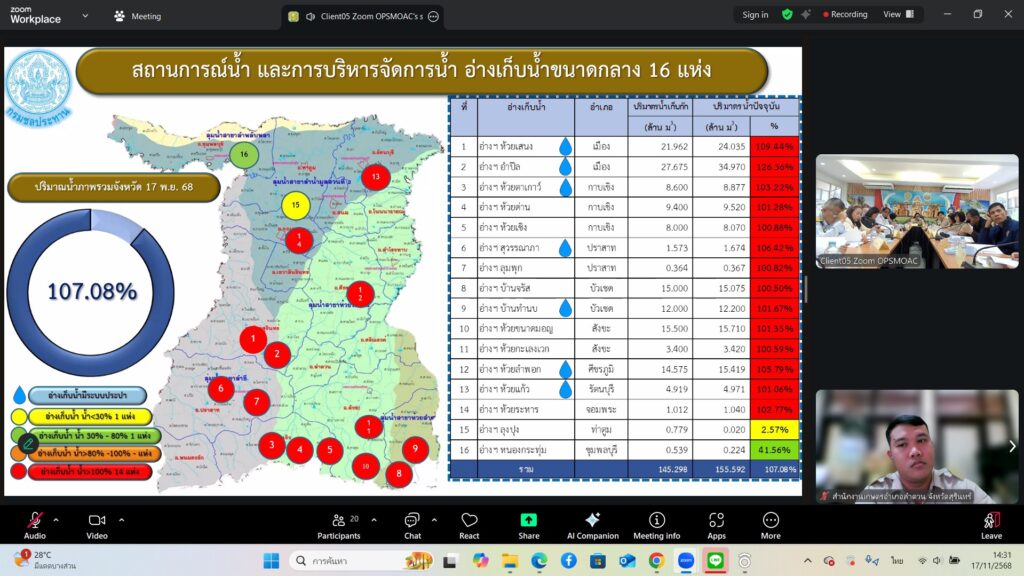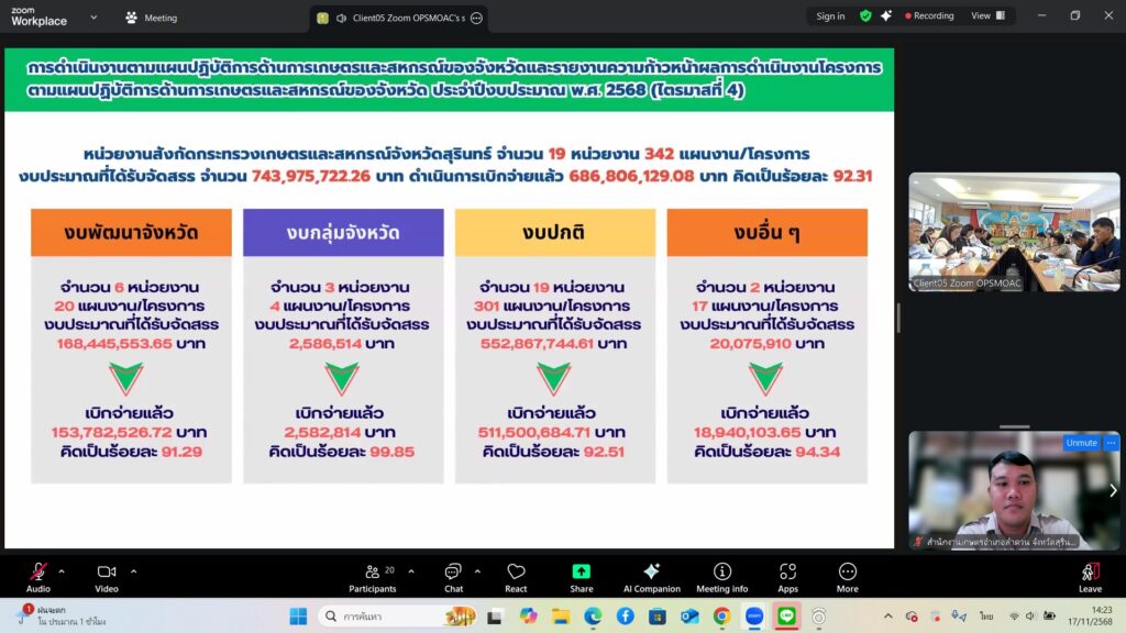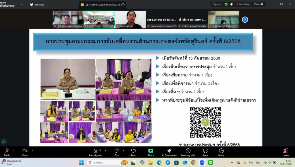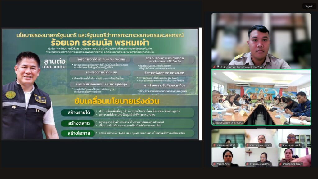วันที่ 17 พฤศจิกายน 2568 เวลา 13.30 น. นายศิริบูรณ์ ดวงแว่ว เกษตรอำเภอลำดวน มอบหมายให้นายยุทธนา นุ่งสวัสดิ์ นักวิชาการส่งเสริมการเกษตรปฏิบัติการ เข้าร่วมการประชุมคณะกรรมการขับเคลื่อนงานด้านการเกษตรจังหวัดสุรินทร์ ครั้งที่ 7/2568 ผ่านระบบออนไลน์ (Zoom Meeting) จากห้องประชุมสำนักงานเกษตรและสหกรณ์จังหวัดสุรินทร์ (ชั้น 2) ตำบลแกใหญ่ อำเภอเมืองสุรินทร์ จังหวัดสุรินทร์ เพื่อรับทราบการขับเคลื่อนนโยบายกระทรวงเกษตรและสหกรณ์ โครงการจัดเก็บข้อมูลด้านการเกษตรในระดับพื้นที่ ปีงบประมาณ พ.ศ. 2569 การตรวจราชการของรัฐมนตรีช่วยว่าการกระทรวงเกษตรและสหกรณ์ (นายอามินทร์ มะยูโซ๊ะ) การดำเนินงานตามแผนปฏิบัติการด้านการเกษตรและสหกรณ์จังหวัดสุรินทร์ ประจำปีงบประมาณ พ.ศ. 2568 (ไตรมาส 4) การสรรหาปราชญ์เกษตรของแผ่นดิน ประจำปี 2569 สถานการณ์น้้ำในอ่างเก็บน้ำขนาดกลางที่สำคัญของจังหวัดสุรินทร์ ภาวะเศรษฐกิจการเกษตร ไตรมาส 3 ปี 2568 และแนวโน้มปี 2568 จังหวัดสุรินทร์ โครงการฟื้นฟูเยียวยาเกษตรกรที่ได้รับผลกระทบจากสถานการณ์ชายแดนไทย – กัมพูชา จังหวัดสุรินทร์ คำสั่งกระทรวงเกษตรและสหกรณ์ ที่ 856/2568 เรื่อง จัดตั้งศูนย์เฉพาะกิจสืบสวน ปราบปรามการกระทำผิดที่เกี่ยวข้องกับการเกษตร (ฉก.พญานาคราช) การส่งเสริมการเพาะปลูกพืชฤดูแล้ง ปี 2568/69 จังหวัดสุรินทร์ และร่วมพิจารณาการจัดทำปฏิทินผลผลิตสินค้าเกษตรรายเดือนระดับจังหวัด ประจำปี 2568 โครงการสินค้าเกษตรและบริการมูลค่าสูง 1 ท้องถิ่น 1 สินค้าเกษตรมูลค่าสูง ประจำปีงบประมาณ พ.ศ. 2569 การเตรียมความพร้อมในการจัดกิจกรรม “Green Gain Day” สร้างการเรียนรู้ และสร้างแรงจูงใจ “ไม่เผาแต่ได้รายได้” ภายใต้โครงการส่งเสริมการเกษตรที่เป็นมิตรกับสิ่งแวดล้อม และการตรวจราชการของรัฐมนตรีว่าการกระทรวงเกษตรและสหกรณ์ (ร้อยเอกธรรมนัส พรหมเผ่า) โดยมีนายวิวัฒน์ชัย หนูทอง เกษตรและสหกรณ์จังหวัดสุรินทร์ เป็นประธานในการประชุม ณ สำนักงานเกษตรอำเภอลำดวน จังหวัดสุรินทร์