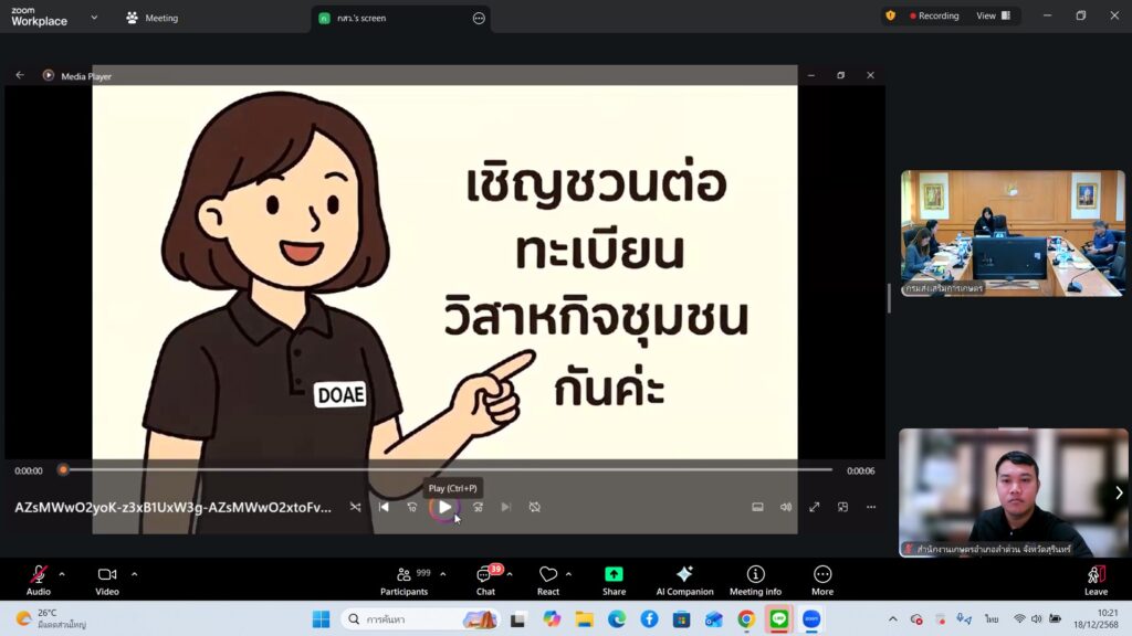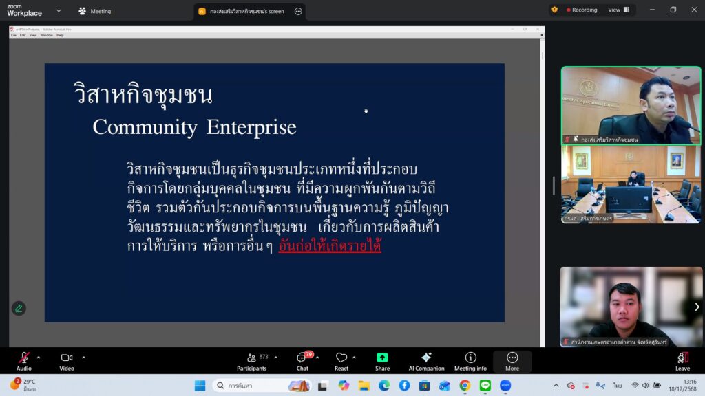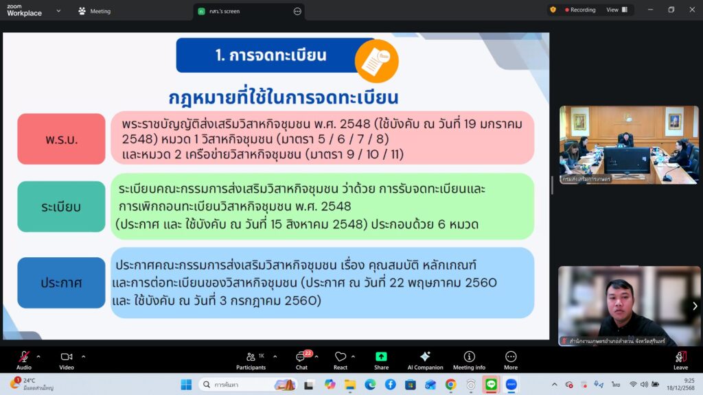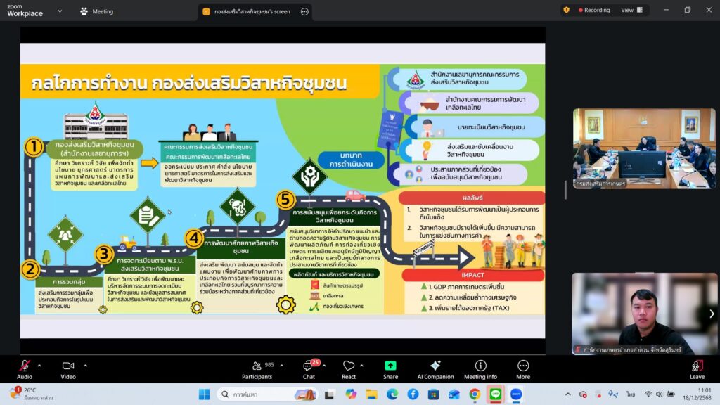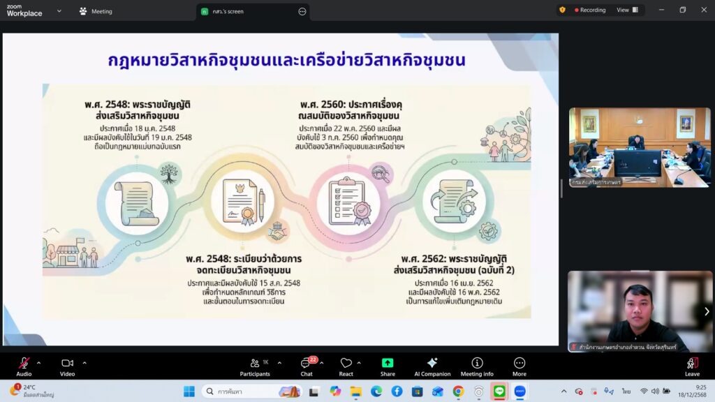 วันที่ 18 ธันวาคม 2568 เวลา 09.00 น. นายศิริบูรณ์ ดวงแว่ว เกษตรอำเภอลำดวน มอบหมายให้นายยุทธนา นุ่งสวัสดิ์ นักวิชาการส่งเสริมการเกษตรปฏิบัติการ เข้าร่วมการอบรมพัฒนาทักษะนายทะเบียนวิสาหกิจชุมชน ผ่านระบบออนไลน์ (Zoom Meeting) จากห้องประชุม 4/1 ชั้น 4 อาคาร 1 กรมส่งเสริมการเกษตร โดยมีวัตถุประสงค์เพื่อสร้างความรู้ ความเข้าใจ ในการดำเนินงานด้านงานทะเบียนวิสาหกิจชุมชน แนวทางการให้คำแนะนำวิสาหกิจชุมชนในการจัดตั้งนิติบุคคล ภาษีที่เกี่ยวข้องกับวิสาหกิจชุมชน การบริหารจัดการด้านการเงิน สามารถให้คำแนะนำด้านพระราชบัญญัติคุ้มครองข้อมูลส่วนบุคคล พ.ศ. 2562 ซึ่งนายทะเบียนวิสาหกิจชุมชน ผู้รับผิดชอบงาน และเจ้าหน้าที่ผู้เกี่ยวข้อง สามารถให้คำแนะนำและแก้ปัญหาในการดำเนินงานด้านทะเบียนวิสาหกิจชุมชนในพื้นที่ รวมถึงการส่งเสริมสนับสนุนวิสาหกิจชุมชนไปสู่ผู้ประกอบการเกษตรและธุรกิจวิสาหกิจชุมชนที่มีความเข้มแข็ง โดยมีนายรพีทัศน์ อุ่นจิตตพันธ์ รองอธิบดีกรมส่งเสริมการเกษตร เป็นประธานในการเปิดการอบรมในครั้งนี้ ณ สำนักงานเกษตรอำเภอลำดวน จังหวัดสุรินทร์