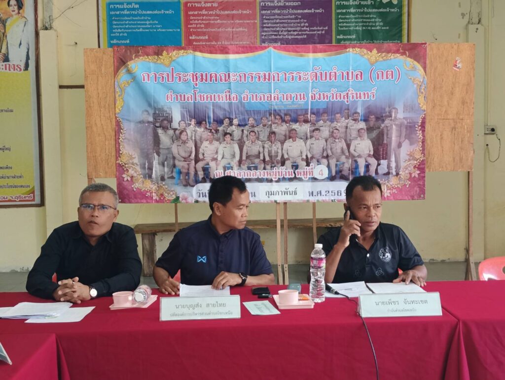 วันที่ 3 กุมภาพันธ์ 2569 เวลา 09.00 น. นายศิริบูรณ์ ดวงแว่ว เกษตรอำเภอลำดวน พร้อมด้วยนายพินิจ มังกร นักวิชาการส่งเสริมการเกษตรชำนาญการ และนางสาวเกศฎา ชูเกต นักวิชาการส่งเสริมการเกษตรปฏิบัติการ เข้าร่วมประชุมคณะกรรมการระดับตำบล (กต.) ตำบลโชคเหนือ เพื่อชี้แจงข้อราชการต่างๆของทางสำนักงานเกษตรอำเภอ มีผู้นำชุมชนและหัวหน้าส่วนราชการเข้าร่วมประชุม จำนวน 50 ราย ณ ศาลาประชาคมบ้านเชิงอะ หมู่ที่ 5 ตำบลโชคเหนือ อำเภอลำดวน จังหวัดสุรินทร์