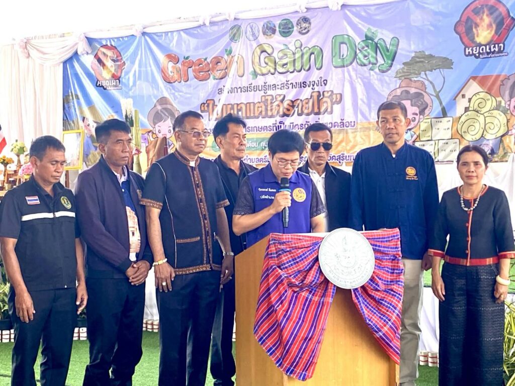 วันที่ 20 กุมภาพันธ์ 2569 เวลา 09.00 น. นายศิริบูรณ์ ดวงแว่ว เกษตรอำเภอลำดวน มอบหมายให้นายพินิจ มังกร นักวิชาการส่งเสริมการเกษตรชำนาญการ เข้าร่วมกิจกรรม “Green Gain Day” สร้างการเรียนรู้และสร้างแรงจูงใจ “ไม่เผาแต่ได้รายได้” ภายใต้โครงการส่งเสริมการเกษตรที่เป็นมิตรกับสิ่งแวดล้อม กิจกรรมส่งเสริมการเกษตรที่เป็นมิตรกับสิ่งแวดล้อม โดยมีวัตถุประสงคเพื่อส่งเสริมการเกษตรที่เป็นมิตรต่อสิ่งแวดล้อม ลดการเผาในพื้นที่การเกษตร เพื่อเสริมสร้างการมีส่วนร่วมของเกษตรกรและชุมชนในการบริหารจัดการพื้นที่และแก้ไขปัญหาการเผาในพื้นที่การเกษตร เพื่อส่งเสริมการปลูกพืชใช้น้ำน้อย เพิ่มประสิทธิภาพการใช้ทรัพยากรและลดความเสี่ยงจากภัยแล้ง และเพื่อสร้างรายได้และมูลค่าเพิ่มจากวัสดุเหลือใช้ทางการเกษตร โดยมีนายกมล โสพัฒน์ ผู้อำนวยการสำนักงานส่งเสริมและพัฒนาการเกษตรที่ 4 จังหวัดขอนแก่น เป็นประธานในพิธี ณ องค์การบริหารส่วนตำบลตรีม ตำบลตรีม อำเภอศีขรภูมิ จังหวัดสุรินทร์