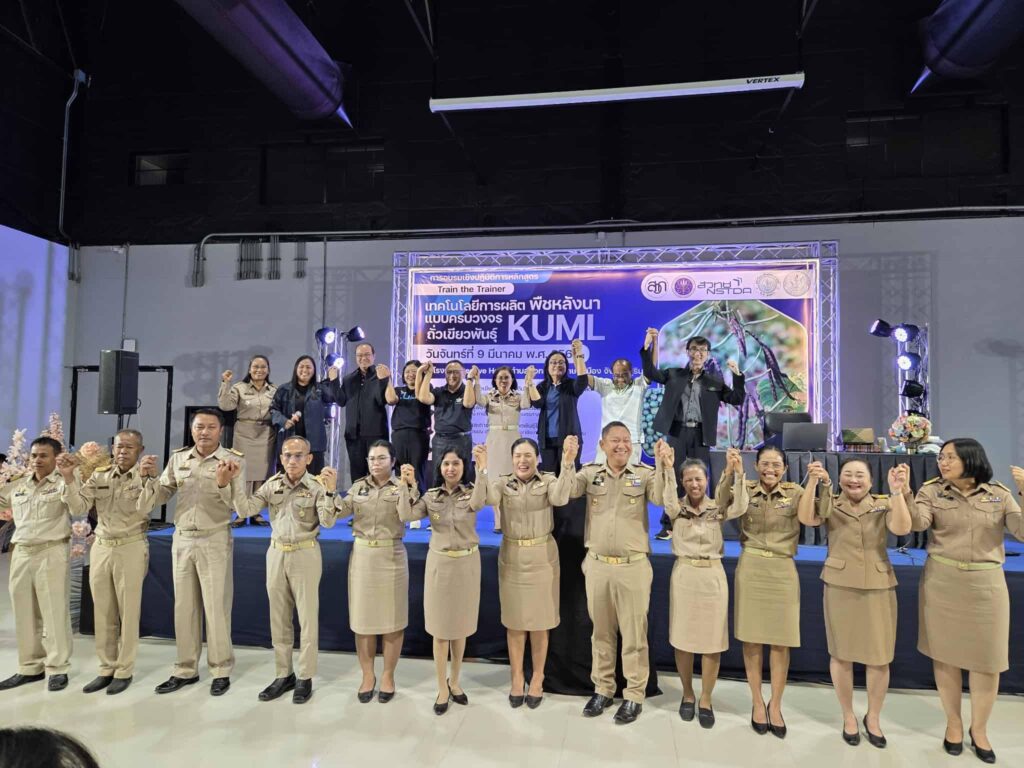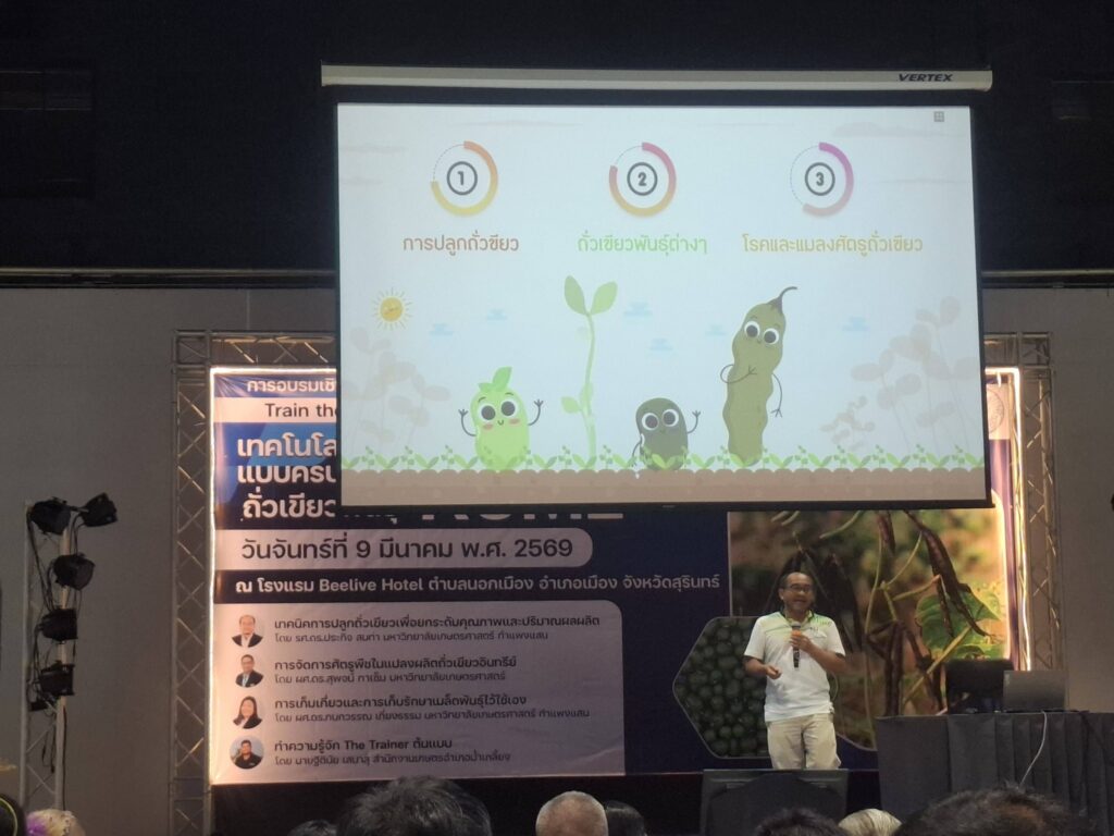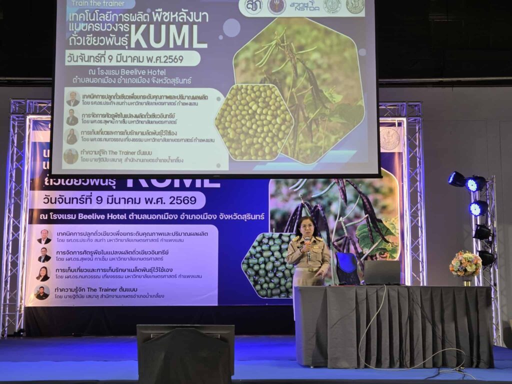 วันที่ 9 มีนาคม 2569 เวลา 09.00 น. นายศิริบูรณ์ ดวงแว่ว พร้อมด้วยเจ้าหน้าที่สำนักงานเกษตรอำเภอลำดวน เข้าร่วมการอบรมเชิงปฏิบัติการ Train the Trainer เทคโนโลยีการผลิตพืชหลังนาแบบครบวงจร ถั่วเขียวพันธุ์ KUML จัดโดยทีมวิทยากรจาก สำนักงานพัฒนาวิทยาศาสตร์และเทคโนโลยีแห่งชาติ (สวทช.) โดยมีวัตถุประสงค์เพื่อพัฒนาศักยภาพเจ้าหน้าที่ส่งเสริมการเกษตรให้มีความรู้และทักษะด้านเทคโนโลยีการผลิตพืชหลังนา โดยเฉพาะการปลูกถั่วเขียวพันธุ์ KUML แบบครบวงจร เพื่อสามารถนำองค์ความรู้ไปถ่ายทอดให้แก่เกษตรกรในพื้นที่ เพิ่มโอกาสในการสร้างรายได้หลังฤดูทำนา และส่งเสริมการใช้ประโยชน์พื้นที่การเกษตรอย่างมีประสิทธิภาพและยั่งยืน โดยมีนางรัตดา คงสีไพร เกษตรจังหวัดสุรินทร์ เป็นประธานเปิดการอบรม ณ โรงแรมบีลีฟ ตำบลนอกเมือง อำเภอเมืองสุรินทร์ จังหวัดสุรินทร์