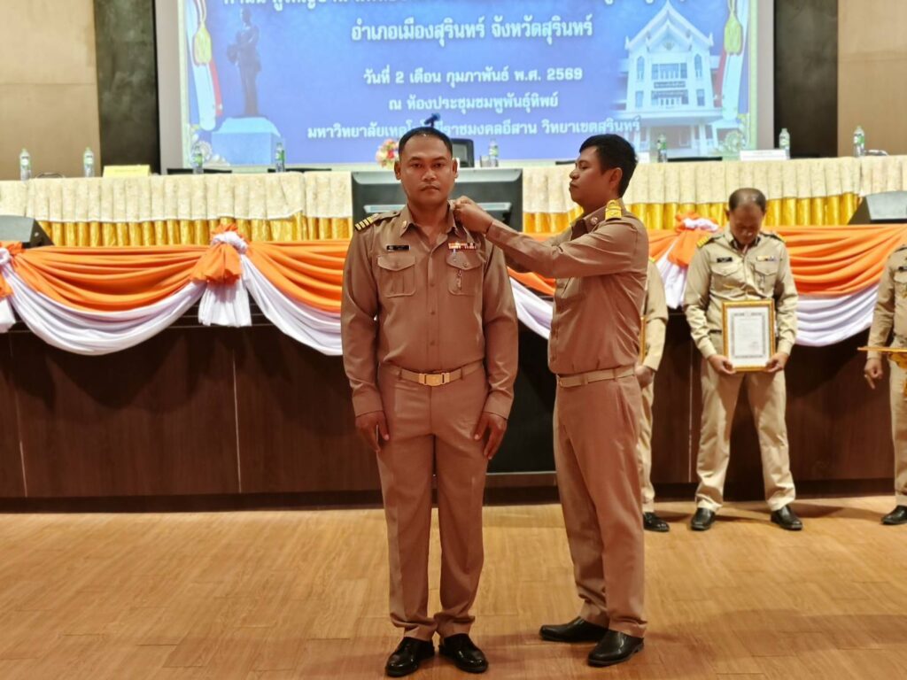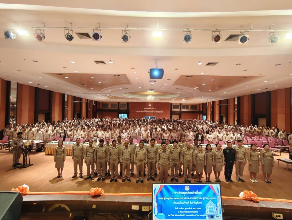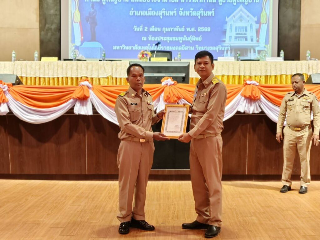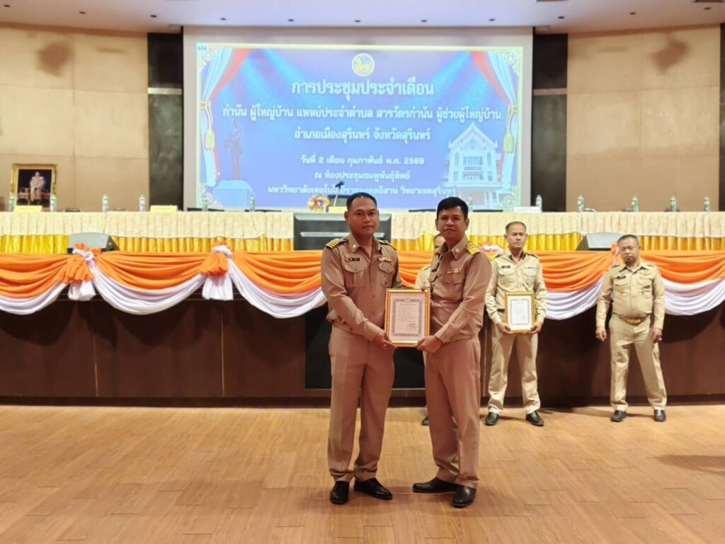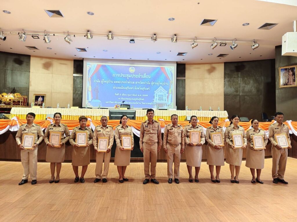 วันที่ 2 กุมภาพันธ์ 2569 เวลา 09.30 น. นางอารีย์ ใจกล้า เกษตรอำเภอเมืองสุรินทร์ มอบหมายให้นางสาวประภาภรณ์ คูสูงเนิน ตำแหน่งนักวิชาการส่งเสริมการเกษตรชำนาญการพิเศษ สังกัดสำนักงานเกษตรอำเภอเมืองสุรินทร์ จังหวัดสุรินทร์ เข้าร่วมการประชุมกำนัน ผู้ใหญ่บ้าน ผู้ช่วยผู้ใหญ่บ้าน แพทย์ประจำตำบล และสารวัตรกำนัน ครั้งที่ 2/2569 ประจำเดือน กุมภาพันธ์ ณ ห้องประชุมชมพูพันธุ์ทิพย์ มหาวิทยาลัยเทคโนโลยีราชมงคลอีสาน วิทยาเขตสุรินทร์ อำเภอเมืองสุรินทร์ จังหวัดสุรินทร์ โดยมีวัตถุประสงค์เพื่อแจ้งข้อราชการที่สำคัญต่างๆ นโยบายเร่งด่วนเพื่อขับเคลื่อนการดำเนินการตามนโยบายรัฐบาล จังหวัด และอำเภอ ให้เป็นไปอย่างมีประสิทธิภาพ และมอบนโยบายการปฏิบัติราชการ ให้กำนัน ผู้ใหญ่บ้าน ฯลฯ นำไปปฏิบัติงานในพื้นที่ โดยก่อนที่จะเข้าสู่วาระการประชุมได้มีพิธีดังนี้