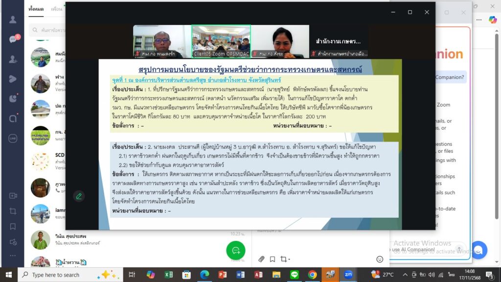 āļ§āļąāļ™āļˆāļąāļ™āļ—āļĢāđŒāļ—āļĩāđˆ 17 āļžāļĪāļĻāļˆāļīāļāļēāļĒāļ™ 2568 āđ€āļ§āļĨāļē 13.30 āļ™.          āļ™āļēāļĒāļ§āļīāļŠāļīāļ•  āļ›āļĢāļ°āđ„āļ§āļĒāđŒ āļ™āļąāļāļ§āļīāļŠāļēāļāļēāļĢāļŠāđˆāļ‡āđ€āļŠāļĢāļīāļĄāļāļēāļĢāđ€āļāļĐāļ•āļĢāļŠāļģāļ™āļēāļāļāļēāļĢ āļĢāļąāļāļĐāļēāļĢāļēāļŠāļāļēāļĢāđāļ—āļ™āđ€āļāļĐāļ•āļĢāļ­āļģāđ€āļ āļ­āļžāļ™āļĄāļ”āļ‡āļĢāļąāļ āđ€āļ‚āđ‰āļēāļĢāđˆāļ§āļĄāļāļēāļĢāļ›āļĢāļ°āļŠāļļāļĄāļ„āļ“āļ°āļāļĢāļĢāļĄāļāļēāļĢāļ‚āļąāļšāđ€āļ„āļĨāļ·āđˆāļ­āļ™āļ‡āļēāļ™āļ”āđ‰āļēāļ™āļāļēāļĢāđ€āļāļĐāļ•āļĢāļˆāļąāļ‡āļŦāļ§āļąāļ”āļŠāļļāļĢāļīāļ™āļ—āļĢāđŒ āļ„āļĢāļąāđ‰āļ‡āļ—āļĩāđˆ 7/2568 āļœāđˆāļēāļ™āļĢāļ°āļšāļšāļ­āļ­āļ™āđ„āļĨāļ™āđŒ Zoom Meeting āļˆāļēāļāļŦāđ‰āļ­āļ‡āļ›āļĢāļ°āļŠāļļāļĄāļŠāļģāļ™āļąāļāļ‡āļēāļ™āđ€āļāļĐāļ•āļĢāđāļĨāļ°āļŠāļŦāļāļĢāļ“āđŒāļˆāļąāļ‡āļŦāļ§āļąāļ”āļŠāļļāļĢāļīāļ™āļ—āļĢāđŒ (āļŠāļąāđ‰āļ™ 2) āļ•āļģāļšāļĨāđāļāđƒāļŦāļāđˆ āļ­āļģāđ€āļ āļ­āđ€āļĄāļ·āļ­āļ‡ āļˆāļąāļ‡āļŦāļ§āļąāļ”āļŠāļļāļĢāļīāļ™āļ—āļĢāđŒ āđ€āļžāļ·āđˆāļ­āļžāļīāļˆāļēāļĢāļ“āļēāļ›āļĢāļ°āđ€āļ”āđ‡āļ™āļāļēāļĢāļ‚āļąāļšāđ€āļ„āļĨāļ·āđˆāļ­āļ™āļ‡āļēāļ™āļ”āđ‰āļēāļ™āļāļēāļĢāđ€āļāļĐāļ•āļĢāđāļĨāļ°āļŠāļŦāļāļĢāļ“āđŒāļ—āļĩāđˆāļŠāļģāļ„āļąāļ āļ›āļĢāļ°āļˆāļģāļ›āļĩāļ‡āļšāļ›āļĢāļ°āļĄāļēāļ“ āļž.āļĻ. 2569 āļžāļĢāđ‰āļ­āļĄāļ—āļąāđ‰āļ‡āļ•āļīāļ”āļ•āļēāļĄ āđāļāđ‰āđ„āļ‚āļ›āļąāļāļŦāļēāđāļĨāļ°āļ­āļļāļ›āļŠāļĢāļĢāļ„āļāļēāļĢāļ›āļāļīāļšāļąāļ•āļīāļ‡āļēāļ™āđƒāļ™āļĢāļ°āļ”āļąāļšāļžāļ·āđ‰āļ™āļ—āļĩāđˆ āđ€āļ‚āđ‰āļēāļĢāđˆāļ§āļĄāļāļēāļĢāļ›āļĢāļ°āļŠāļļāļĄ āļŊ āļ“ āļŠāļģāļ™āļąāļāļ‡āļēāļ™āđ€āļāļĐāļ•āļĢāļ­āļģāđ€āļ āļ­āļžāļ™āļĄāļ”āļ‡āļĢāļąāļ āļˆāļąāļ‡āļŦāļ§āļąāļ”āļŠāļļāļĢāļīāļ™āļ—āļĢāđŒ