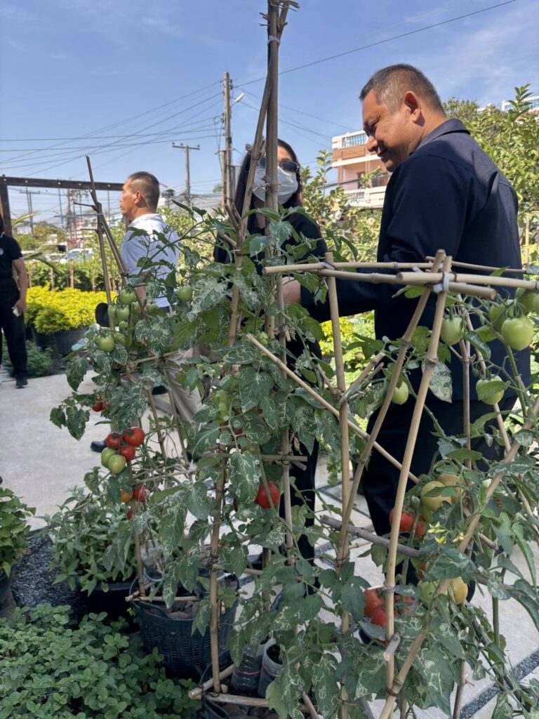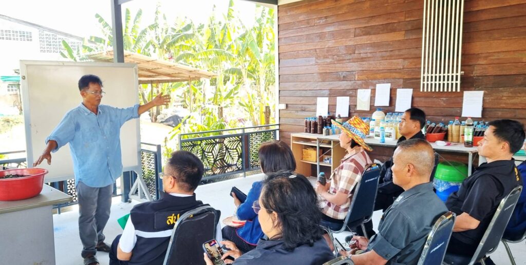 นอกจากนี้ผู้เข้าร่วมประชุมยังร่วมศึกษาดูงาน ณ ศูนย์เรียนรู้การเกษตรแบบยั่งยืน ถนนทุ่งโพธิ์ ตำบลนอกเมือง เพื่อแลกเปลี่ยนเรียนรู้แนวทางการดำเนินงานด้านการผลิตอาหารปลอดภัยในสถานศึกษา และเสริมสร้างความเข้าใจในการดำเนินกิจกรรมให้เป็นไปในทิศทางเดียวกัน เพื่อส่งเสริมให้โรงเรียนสามารถผลิตวัตถุดิบทางการเกษตรที่ปลอดภัยและเพียงพอสำหรับประกอบอาหารกลางวันของนักเรียน ช่วยลดค่าใช้จ่ายด้านอาหาร เพิ่มคุณค่าทางโภชนาการ และปลูกฝังทักษะอาชีพด้านการเกษตรให้แก่นักเรียน นอกจากนี้ยังมุ่งเน้นการบูรณาการความร่วมมือระหว่างหน่วยงานภาครัฐ ครู และเกษตรกรในพื้นที่ เพื่อสร้างความมั่นคงทางอาหารและความยั่งยืนในระดับชุมชน