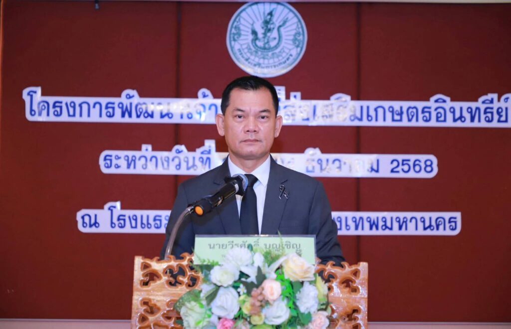 นางรัตดา คงสีไพร เกษตรจังหวัดสุรินทร์ มอบหมายให้ นางสาวดารารัตน์ ปิ่นมงคลกุล นักวิชาการส่งเสริมการเกษตรชำนาญการ กลุ่มอารักขาพืช สำนักงานเกษตรจังหวัดสุรินทร์ พร้อมด้วยนางสาวนันท์นภัสร์ งามวิไล นักวิชาการส่งเสริมการเกษตรปฏิบัติการ สำนักงานเกษตรอำเภอสำโรงทาบ เข้าร่วมการฝึกอบรมโครงการพัฒนาเจ้าหน้าที่ส่งเสริมเกษตรอินทรีย์ โดยมีนายวีรศักดิ์ บุญเชิญ รองอธิบดีกรมส่งเสิมการเกษตรเป็นประธานในพิธีเปิดการฝึกอบรมฯ ณ โรงแรม เอบีน่า เฮาส์ กรุงเทพมหานคร ซึ่งสำนักส่งเสริมและจัดการสินค้าเกษตรกำหนดจัดขึ้น ระหว่างวันที่ 22 – 24 ธันวาคม 2568 มีวัตถุประสงค์เพื่อพัฒนาเจ้าหน้าที่ส่งเสริมการเกษตรในพื้นที่ ให้มีความรู้ด้านการผลิตสินค้าเกษตรตามระบบมาตรฐานเกษตรอินทรีย์ และมาตรฐานอื่น ๆ และสามารถถ่ายทอดความรู้ เป็นที่ปรึกษาให้กับเกษตรกรได้