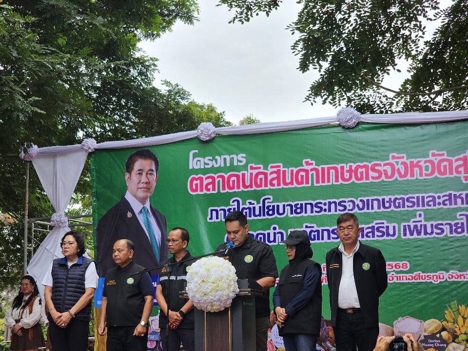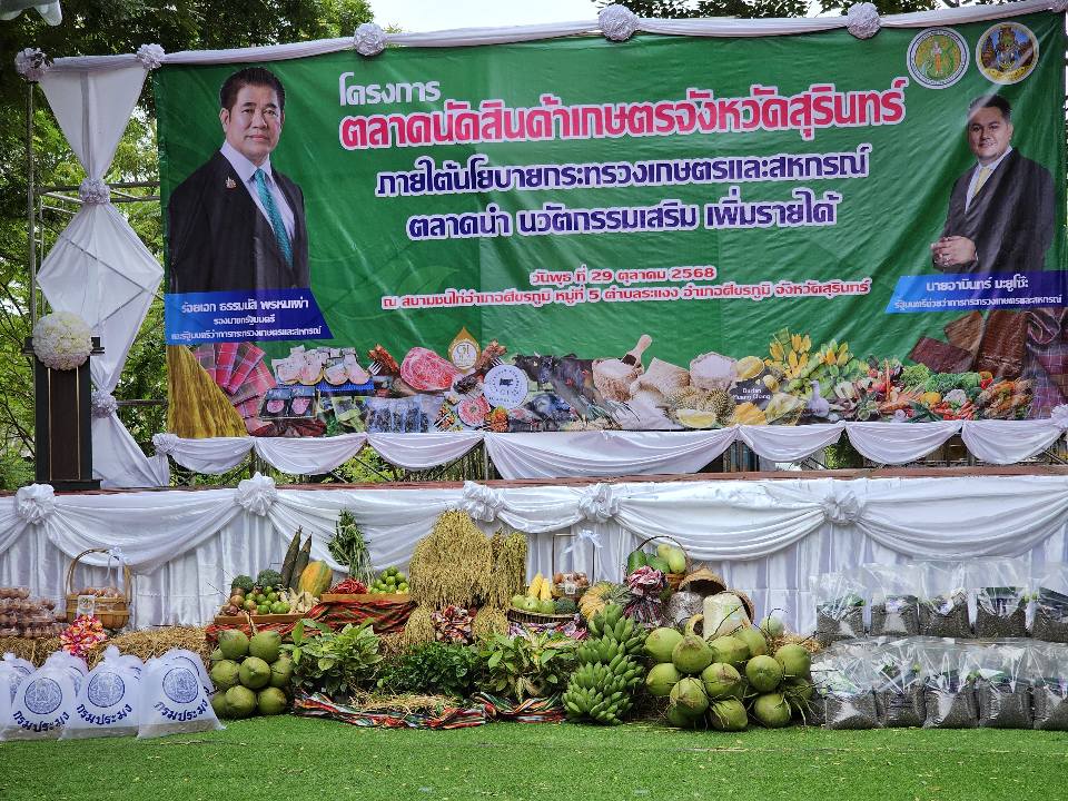 วันที่ 29 เดือนตุลาคม 2568 นายสมพงษ์ มีสิทธิ์ เกษตรอำเภอศีขรภูมิ พร้อมด้วยเจ้าหน้าที่สำนักงานเกษตรอำเภอศีขรภูมิ ต้อนรับ นายอามินทร์ มะยูโซ๊ะ รัฐมนตรีช่วยว่าการกระทรวงเกษตรและสหกรณ์ ตามโครงการตลาดนัดสินค้าเกษตรจังหวัดสุรินทร์ ภายใต้นโยบายกระทรวงเกษตรและสหกรณ์ ตลาดนำ นวัตกรรมเสริม เพิ่มรายได้ ณ สนามชนไก่ ตำบลระแงง อำเภอศีขรภูมิ จังหวัดสุรินทร์