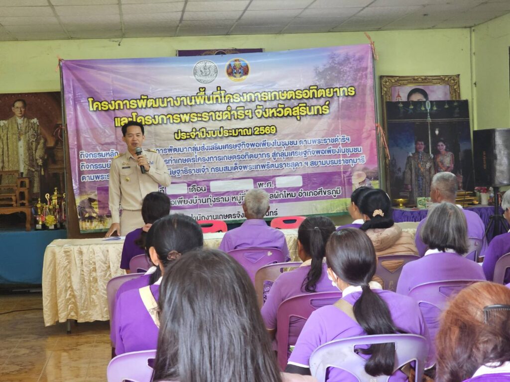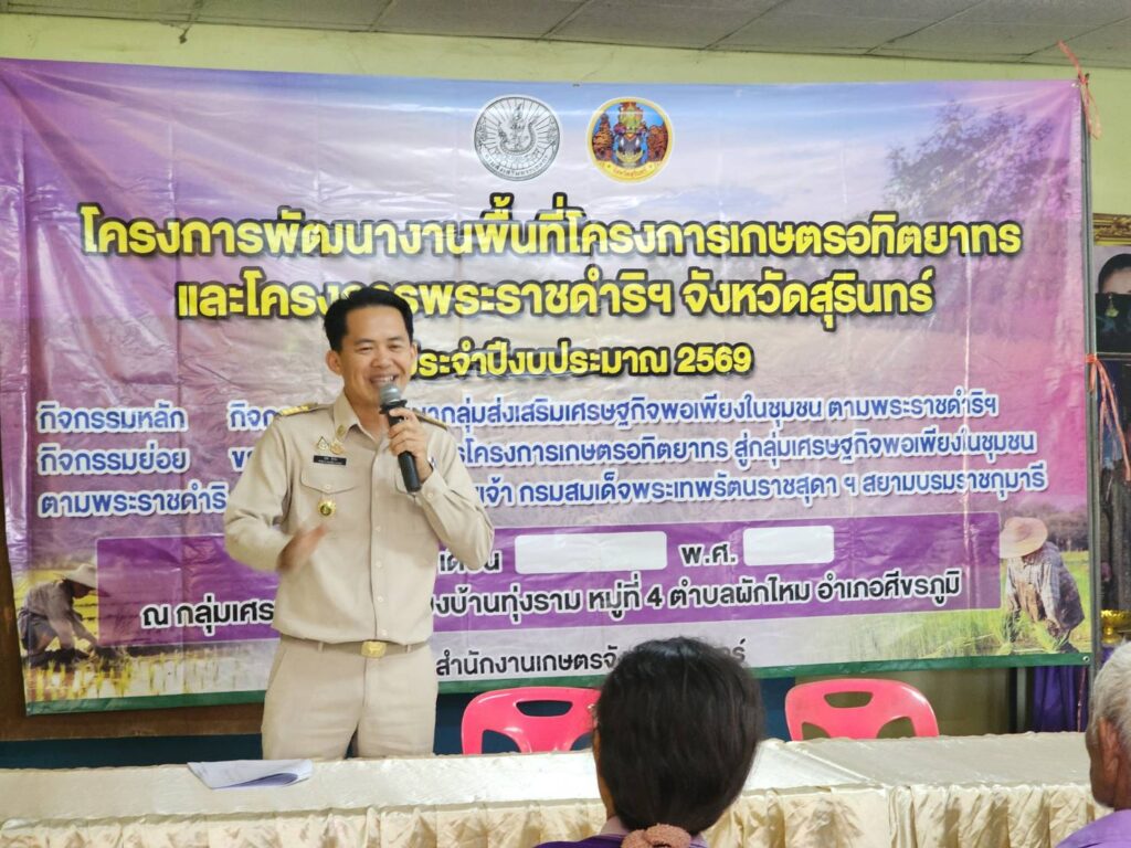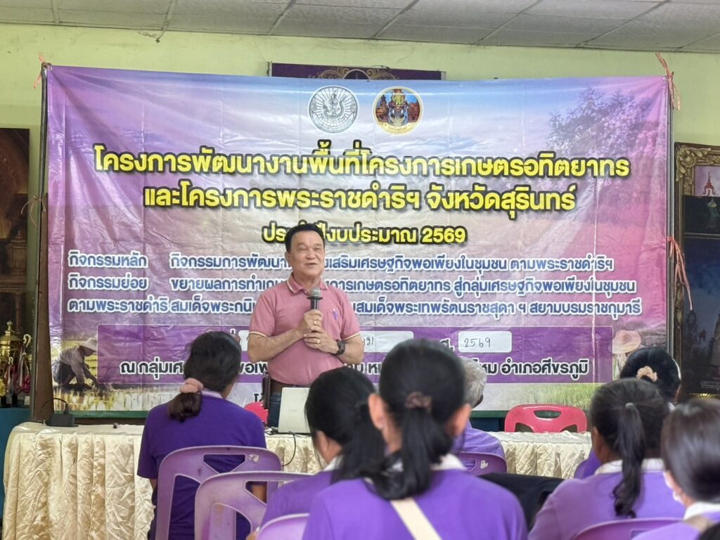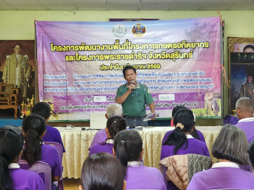 วันที่ 26 เดือนมกราคม 2569 นายสมพงษ์ มีสิทธิ์ เกษตรอำเภอศีขรภูมิ พร้อมด้วยเจ้าหน้าที่สำนักงานเกษตรอำเภอ เข้าร่วมอบรมกิจกรรมการพัฒนากลุ่มส่งเสริมเศรษฐกิจพอเพียงในชุมชน ตามพระราชดำริฯ กิจกรรมย่อย ขยายผลการทำเกษตรโครงการเกษตรอทิตยาทร ด้านหลักปรัชญาเศรษฐกิจพอเพียง การผลิตข้าวคุณภาพดี การจัดการศัตรูพืชแบบผสมผสาน การแปรรูปและพัฒนาผลิตภัณฑ์ และการบริหารจัดการกลุ่ม ทั้งนี้ ได้ลงแปลงแลกเปลี่ยนเรียนรู้ในแปลงเรีวนรู้ ที่มีการปลูกพืชผักสวนครัว และข้าวโพด เพื่อสมาชิกจะได้น้อมนำไปใช้ในชีวิตประจำวันต่อไป ณ ศูนย์เศรษฐกิจพอเพียงบ้านทุ่งราม ม.4 ต.ผักไหม อ.ศีขรภูมิ จ.สุรินทร์