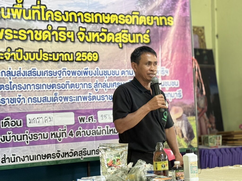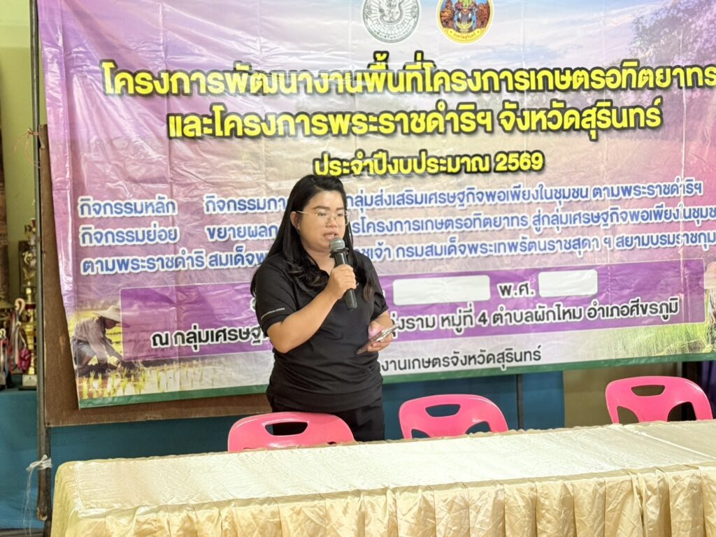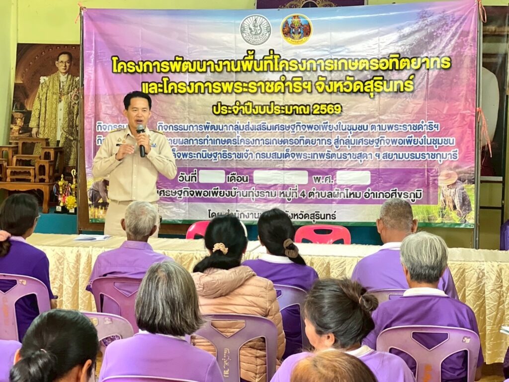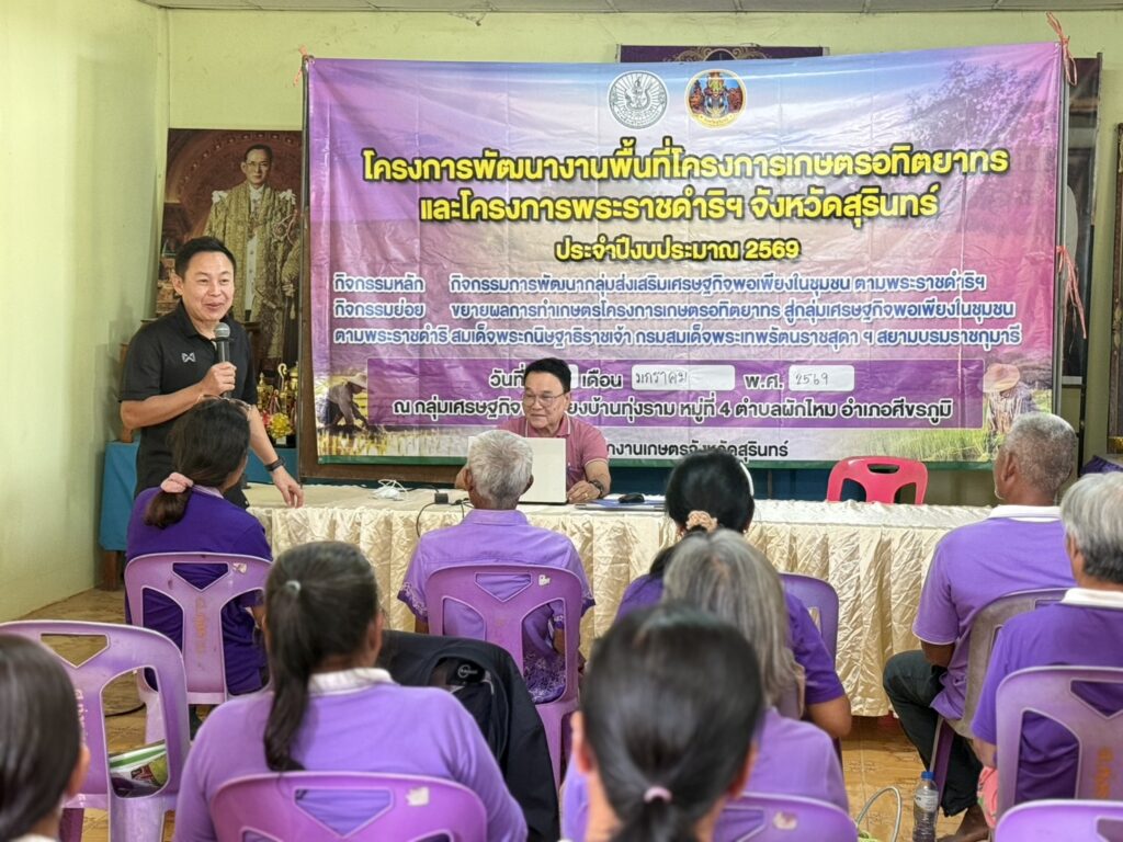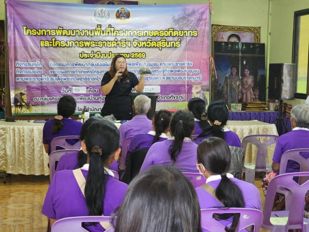 วันที่ 26 เดือนมกราคม 2569 นายสมพงษ์ มีสิทธิ์ เกษตรอำเภอศีขรภูมิ พร้อมด้วยเจ้าหน้าที่สำนักงานเกษตรอำเภอ เข้าร่วมอบรมกิจกรรมการพัฒนากลุ่มส่งเสริมเศรษฐกิจพอเพียงในชุมชน ตามพระราชดำริฯ กิจกรรมย่อย ขยายผลการทำเกษตรโครงการเกษตรอทิตยาทร ด้านหลักปรัชญาเศรษฐกิจพอเพียง การผลิตข้าวคุณภาพดี การจัดการศัตรูพืชแบบผสมผสาน การแปรรูปและพัฒนาผลิตภัณฑ์ และการบริหารจัดการกลุ่ม ทั้งนี้ ได้ลงแปลงแลกเปลี่ยนเรียนรู้ในแปลงเรีวนรู้ ที่มีการปลูกพืชผักสวนครัว และข้าวโพด เพื่อสมาชิกจะได้น้อมนำไปใช้ในชีวิตประจำวันต่อไป ณ ศูนย์เศรษฐกิจพอเพียงบ้านทุ่งราม ม.4 ต.ผักไหม อ.ศีขรภูมิ จ.สุรินทร์