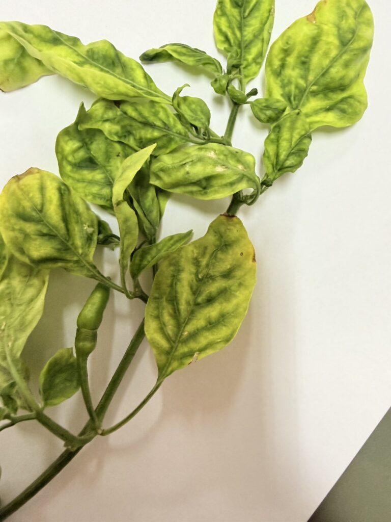 วันที่ 20 มีนาคม 2569 นายสมพงษ์ มีสิทธิ์ เกษตรอำเภอศีขรภูมิ มอบหมายให้นางสาวพัณณิตา ชัยตั้งจิต นักวิชาการส่งเสริมการเกษตรปฏิบัติการ ให้บริการตรวจวินิจฉัยอาการผิดปกติของพริกที่เกษตรกรได้นำมาให้เบื้องต้น ซึ่งพบว่าใบพริกมีลักษณะใบหงิกด่างสีเหลือง ใบโค้งงอ หงิกย่น บิดเบี้ยว ยอดเป็นกระจุก ซึ่งเป็นลักษณะของโรคใบหงิกเหลืองจากเชื้อไวรัส ที่เกิดจากแมลงหวี่ขาวยาสูบเป็นแมลงพาหะ ทั้งนี้ เจ้าหน้าที่ได้ให้คำแนะนำในการกำจัดโรคและแมลงให้แก่เกษตรกรเบื้องต้น ณ สำนักงานเกษตรอำเภอศีขรภูมิ จังหวัดสุรินทร์