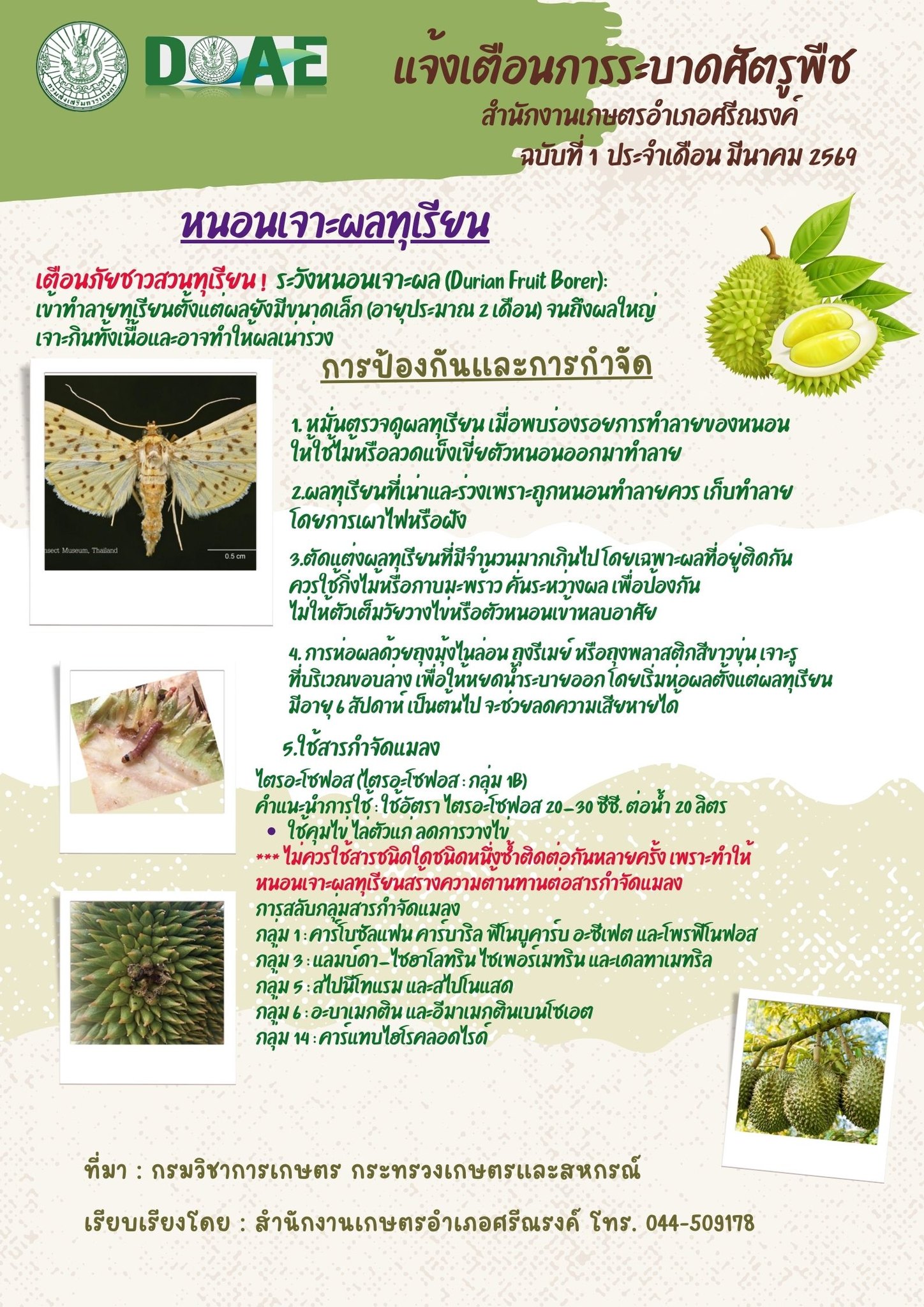 āđ€āļ™āļ·āđˆāļ­āļ‡āļˆāļēāļāļ‚āļ“āļ°āļ™āļĩāđ‰āļ—āļļāđ€āļĢāļĩāļĒāļ™āđƒāļ™āļŦāļĨāļēāļĒāļžāļ·āđ‰āļ™āļ—āļĩāđˆāļāļģāļĨāļąāļ‡āļ­āļĒāļđāđˆāđƒāļ™āļŠāđˆāļ§āļ‡āļžāļąāļ’āļ™āļēāļœāļĨ āļ‹āļķāđˆāļ‡āđ€āļ›āđ‡āļ™āļĢāļ°āļĒāļ°āļ—āļĩāđˆāđ€āļŠāļĩāđˆāļĒāļ‡āļ•āđˆāļ­āļāļēāļĢāļ–āļđāļ āļŦāļ™āļ­āļ™āđ€āļˆāļēāļ°āļœāļĨāļ—āļļāđ€āļĢāļĩāļĒāļ™ (Durian Fruit Borer) āđ€āļ‚āđ‰āļēāļ—āļģāļĨāļēāļĒāļ­āļĒāđˆāļēāļ‡āļĢāļļāļ™āđāļĢāļ‡ āļŠāļģāļ™āļąāļāļ‡āļēāļ™āđ€āļāļĐāļ•āļĢāļ­āļģāđ€āļ āļ­āļĻāļĢāļĩāļ“āļĢāļ‡āļ„āđŒāļˆāļķāļ‡āļ‚āļ­āđƒāļŦāđ‰āļžāļĩāđˆāļ™āđ‰āļ­āļ‡āđ€āļāļĐāļ•āļĢāļāļĢāļœāļđāđ‰āļ›āļĨāļđāļāļ—āļļāđ€āļĢāļĩāļĒāļ™āđ€āļāđ‰āļēāļĢāļ°āļ§āļąāļ‡āđāļĨāļ°āļŠāļģāļĢāļ§āļˆāļŠāļ§āļ™āļ­āļĒāđˆāļēāļ‡āđƒāļāļĨāđ‰āļŠāļīāļ” āđ‚āļ”āļĒāļĄāļĩāļĢāļēāļĒāļĨāļ°āđ€āļ­āļĩāļĒāļ”āļāļēāļĢāđ€āļāđ‰āļēāļĢāļ°āļ§āļąāļ‡āļ”āļąāļ‡āļ™āļĩāđ‰: