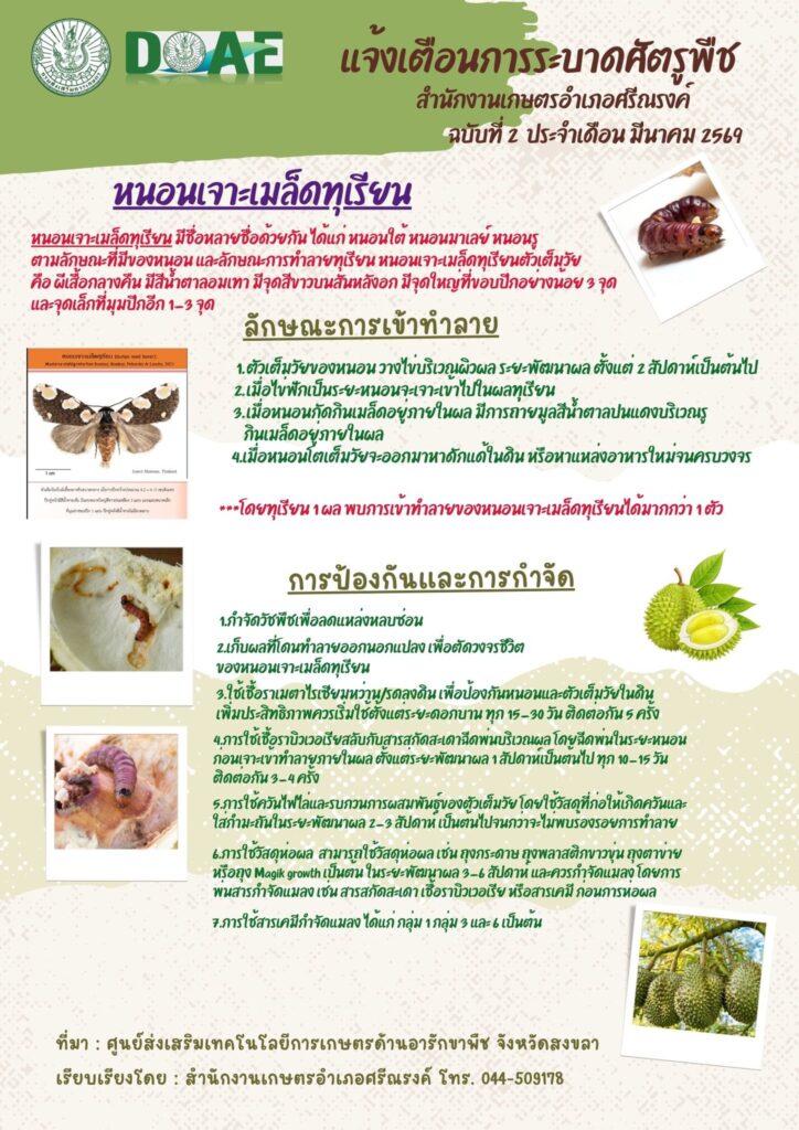 เนื่องด้วยสภาพอากาศในปัจจุบันเอื้ออำนวยต่อการระบาดของศัตรูพืช ขอแจ้งเตือนให้เกษตรกรผู้ปลูกทุเรียนเฝ้าระวังและหมั่นตรวจเช็กสวนอย่างใกล้ชิด เพื่อป้องกันความเสียหายต่อผลผลิต