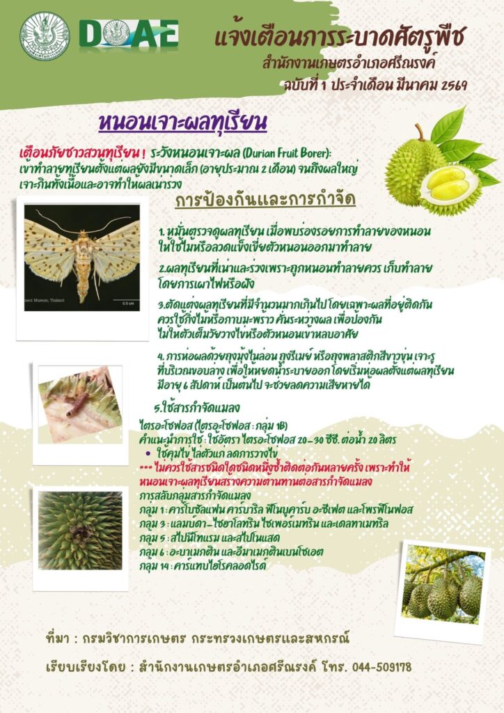 นื่องจากขณะนี้ทุเรียนในหลายพื้นที่กำลังอยู่ในช่วงพัฒนาผล ซึ่งเป็นระยะที่เสี่ยงต่อการถูก หนอนเจาะผลทุเรียน (Durian Fruit Borer) เข้าทำลายอย่างรุนแรง สำนักงานเกษตรอำเภอศรีณรงค์จึงขอให้พี่น้องเกษตรกรผู้ปลูกทุเรียนเฝ้าระวังและสำรวจสวนอย่างใกล้ชิด