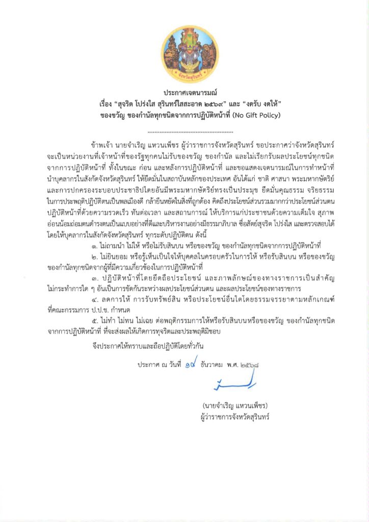 จังหวัดสุรินทร์ ประกาศเจตนารมณ์ “สุจริต โปร่งใส สุรินทร์ใสสะอาด 2569”By thatum / 24 ธันวาคม 2025 จังหวัดสุรินทร์ ประกาศเจตนารมณ์“สุจริต โปร่งใส สุรินทร์ใสสะอาด 2569”