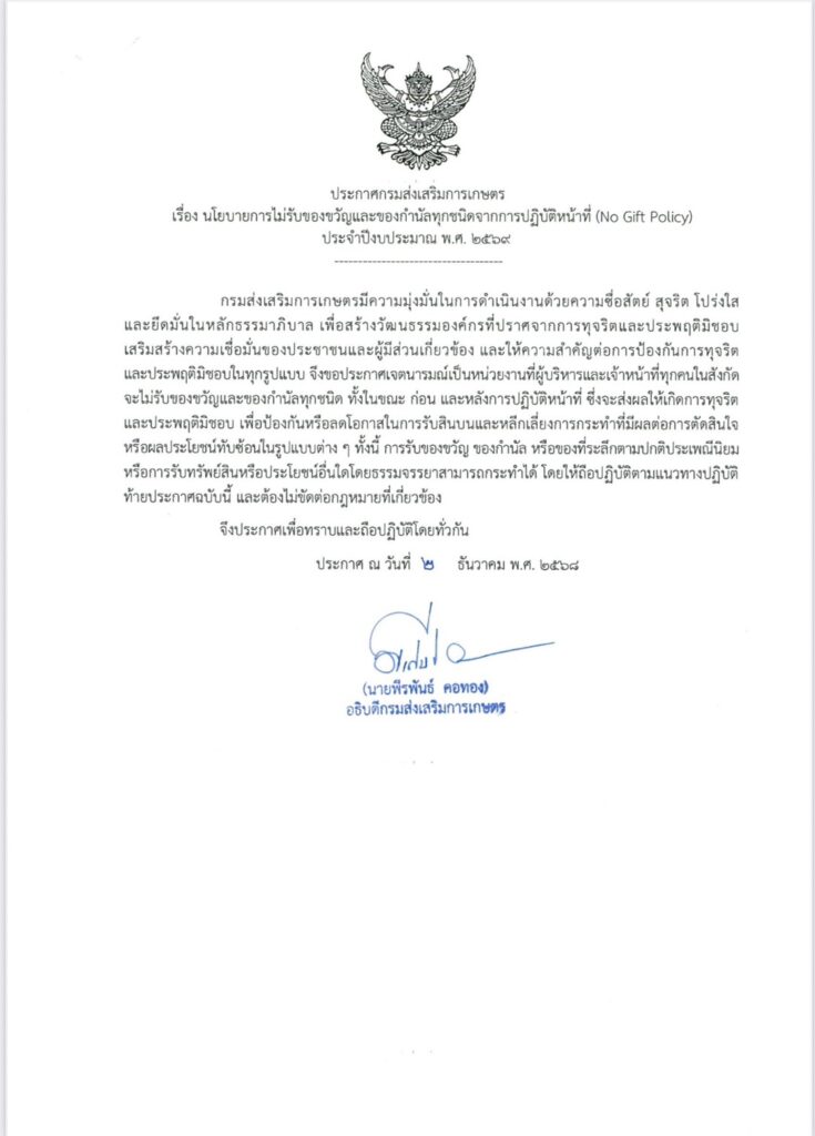 สำนักงานเกษตรอำเภอท่าตูม ไม่รับของขวัญและของกำนัลทุกชนิดจากการปฏิบัติหน้าที่ (No Gift Policy) ประจำปีงบประมาณ พ.ศ. 2569By thatum / 24 ธันวาคม 2025 สำนักงานเกษตรอำเภอท่าตูม ไม่รับของขวัญและของกำนัลทุกชนิดจากการปฏิบัติหน้าที่ (No Gift Policy)ประจำปีงบประมาณ พ.ศ. 2569