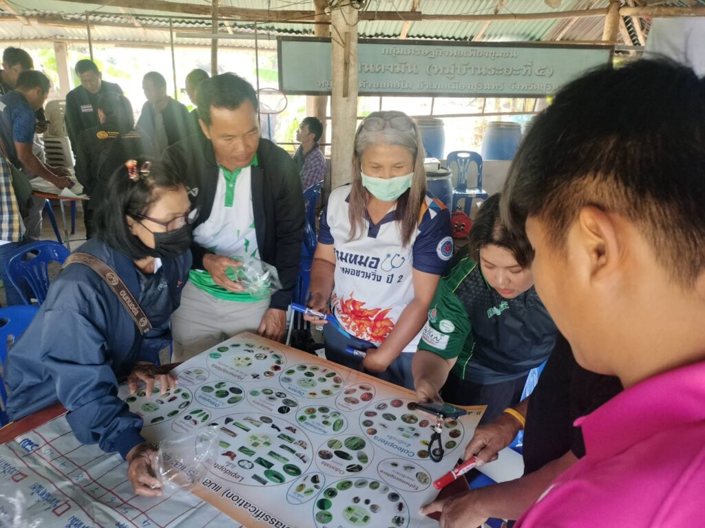 นางสกาวรัตน์ ทัดศรี เกษตรอำเภอท่าตูม มอบหมายให้เจ้าหน้าที่สำนักงานเกษตรอำเภอท่าตูม พร้อมด้วยเกษตรกรผู้สำรวจแปลงติดตามสถานการณ์ศัตรูพืช เข้าร่วมโครงการส่งเสริมการจัดการสุขภาพพืชเพื่อเพิ่มประสิทธิภาพการผลิตสินค้าเกษตร กิจกรรมเฝ้าระวังและเตรียมความพร้อมรับมือสถานการณ์การระบาดศัตรูพืชเชิงรุก กิจกรรมย่อยพัฒนาเกษตรกรผู้สำรวจแปลงติดตามสถานการณ์ศัตรูพืช โดยมีเกษตรกรเป้าหมายเข้าร่วมโครงการจำนวน 38 ราย ณ ศูนย์เรียนรู้เศรษฐกิจพอเพียงบ้านดงมัน หมู่ที่ 8 ตำบลคอโค อำเภอเมืองสุรินทร์ จังหวัดสุรินทร์